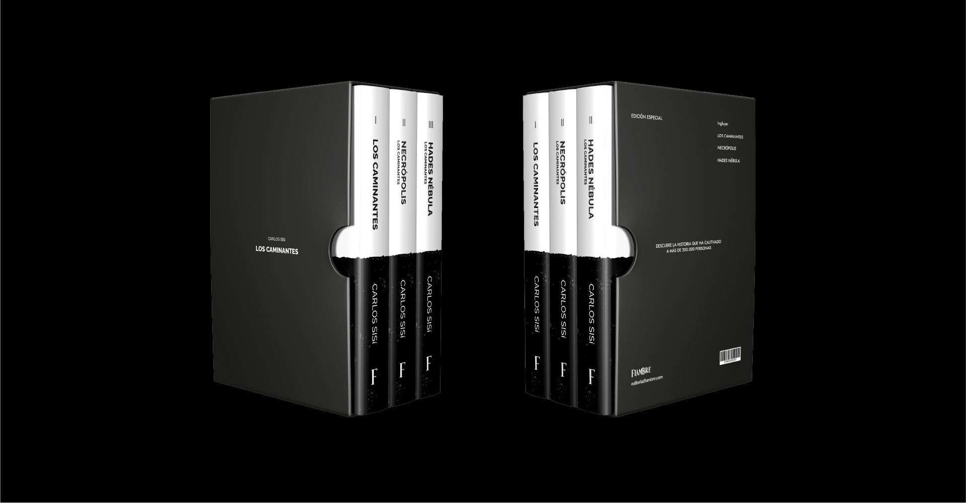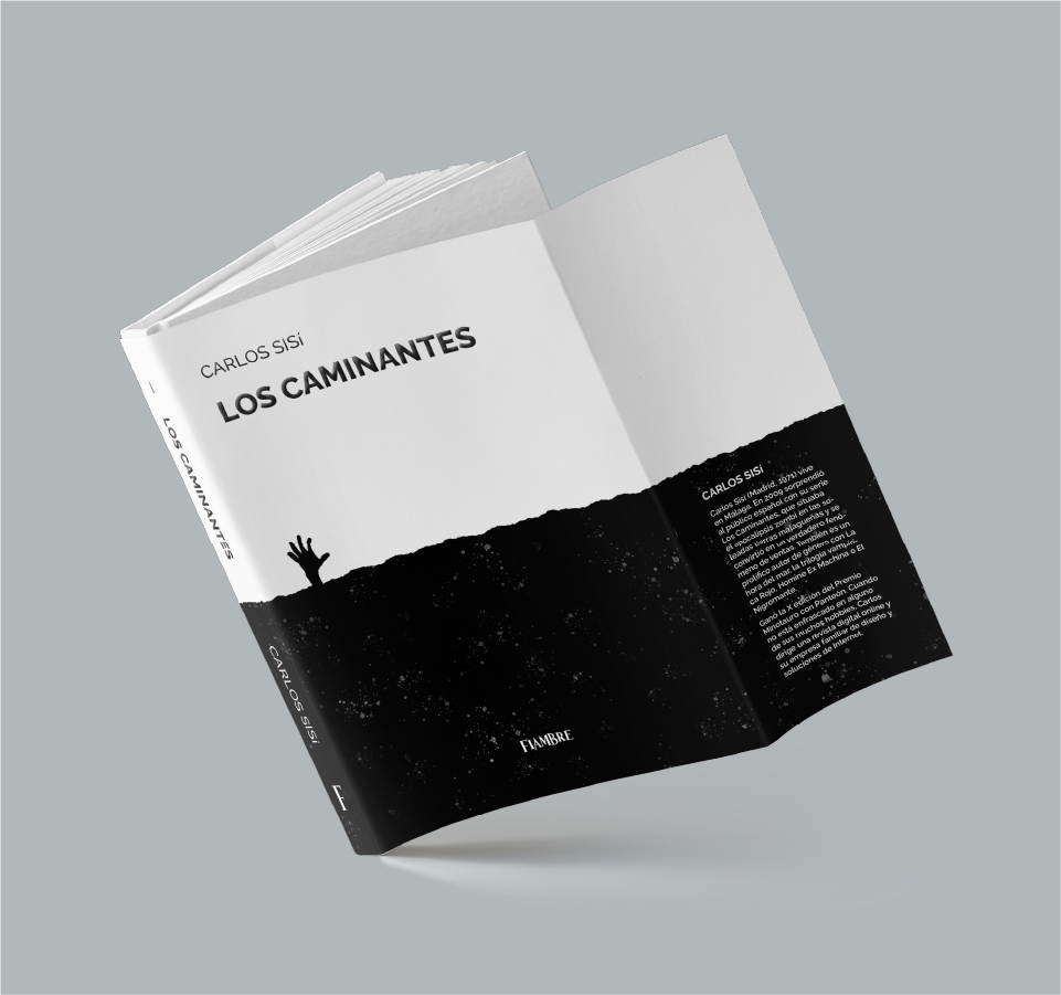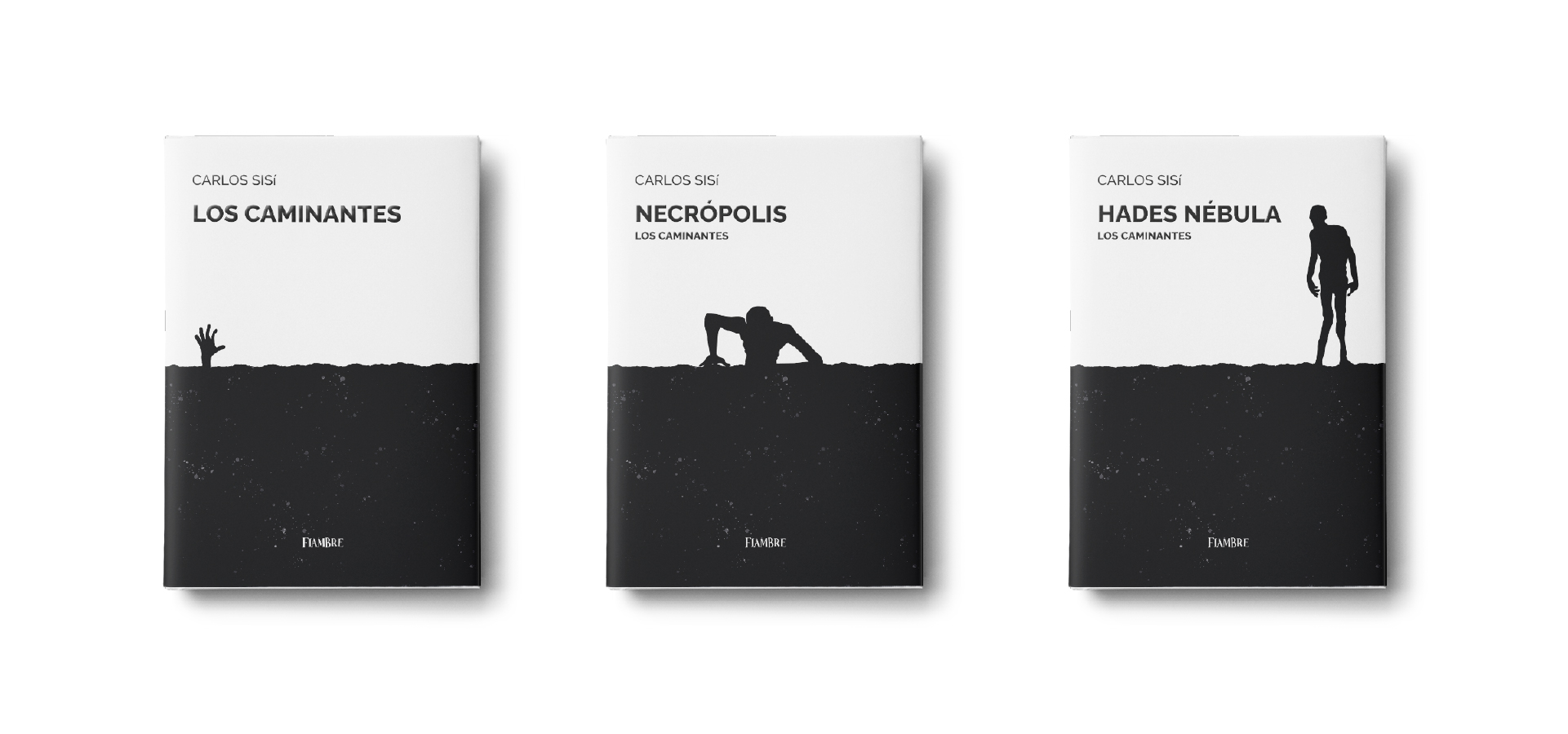 Diseño integral de las sobrecubiertas, cubiertas, lomos y páginas de guarda de los libros de la famosa trilogía de zombis “Los Caminantes” de Carlos Sisí.